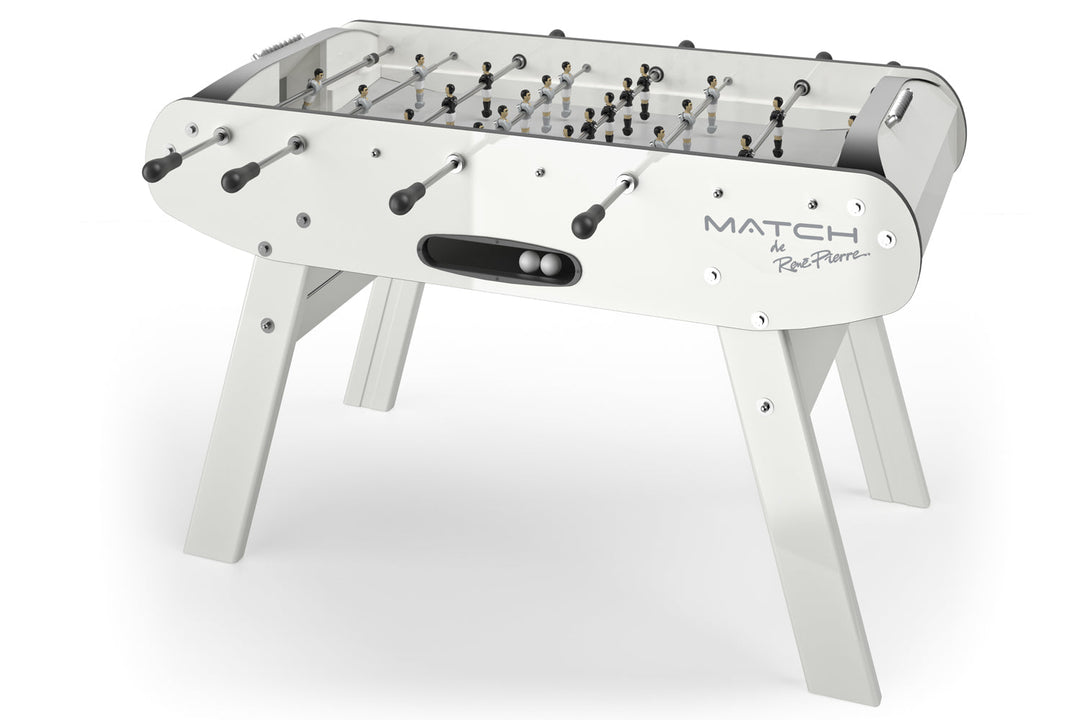 This updated classic enhances any game room. The René Pierre MATCH BLANC Foosball Table is designed and handmade in France. This solid table features a sturdy MDF cabinet with lacquered finish- Sloped corners in the play field keep the ball in play- Telescopic playing rods with ergonomic play handles and bumper springs- Die cast aluminum players are hand painted- Abacus style scoring units with metal score pieces- Insert able leg levelers (included) ensure a level play field. The table includes everything you need to get started and makes an attractive addition to any home game space.