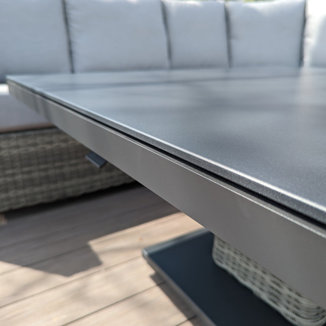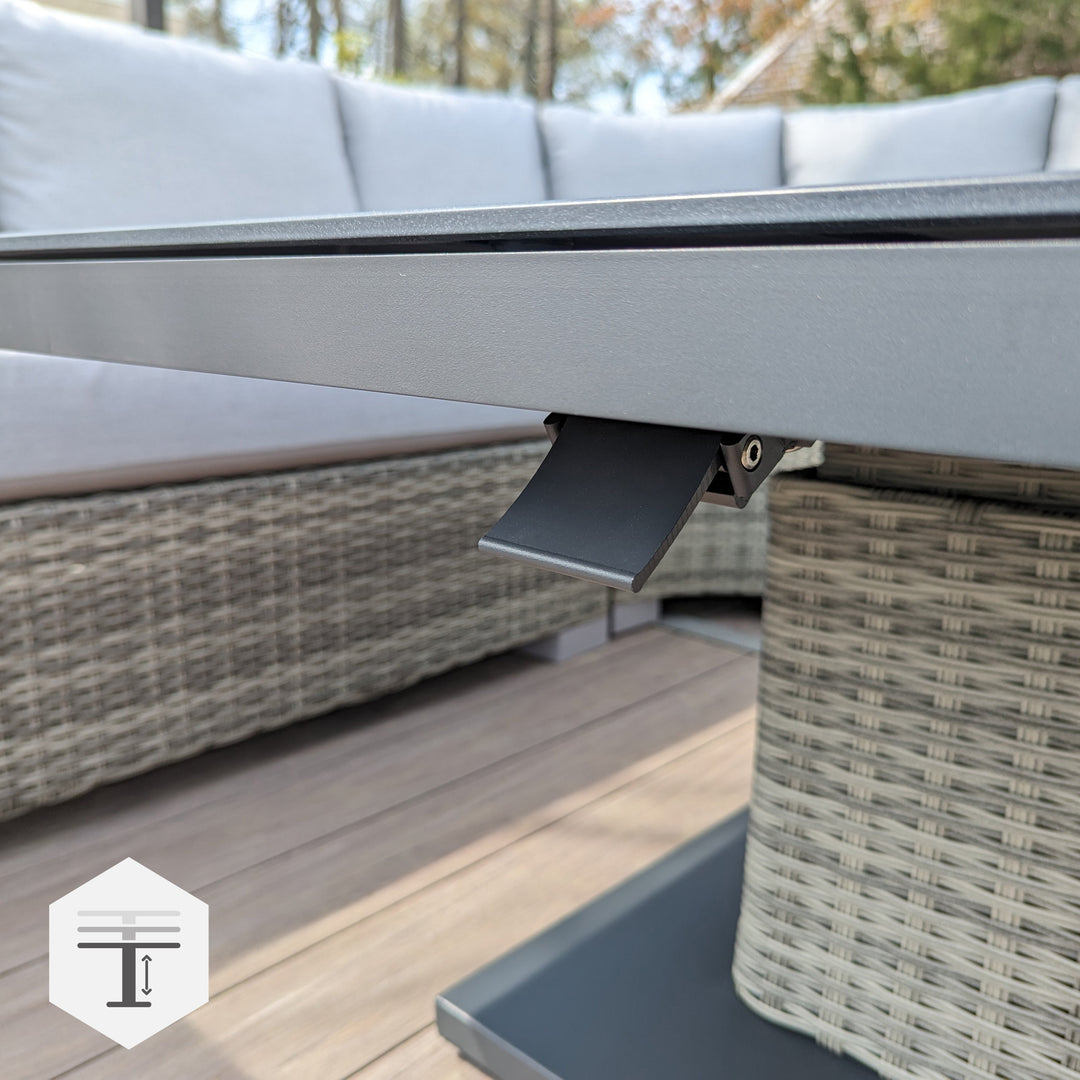 The Aya collection is recognized for its outstanding seating comfort. The seat height and cushion thickness make it ideal for both lounging and dining. The coordinating table can be easily adjusted from a low coffee table (19”) to a fully functional dining table (29”) and any height in between.