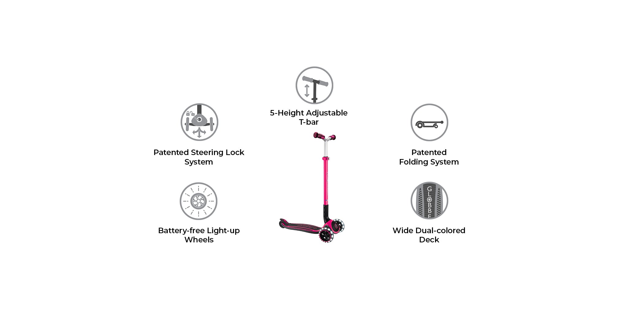 • No batteries are needed, as the light-up wheels use dynamo lighting—it runs purely on the kinetic energy produced by your scooting power, which means it’s battery-free!
