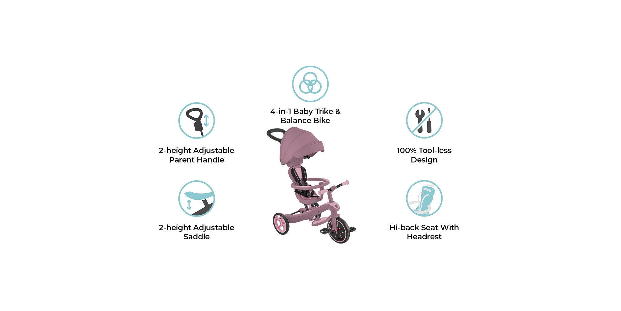 • Transforms into 4 different modes: infant trike (10-36M), guided trike (18-36M), training trike (24-36M), and balance bike (2- 5Y).