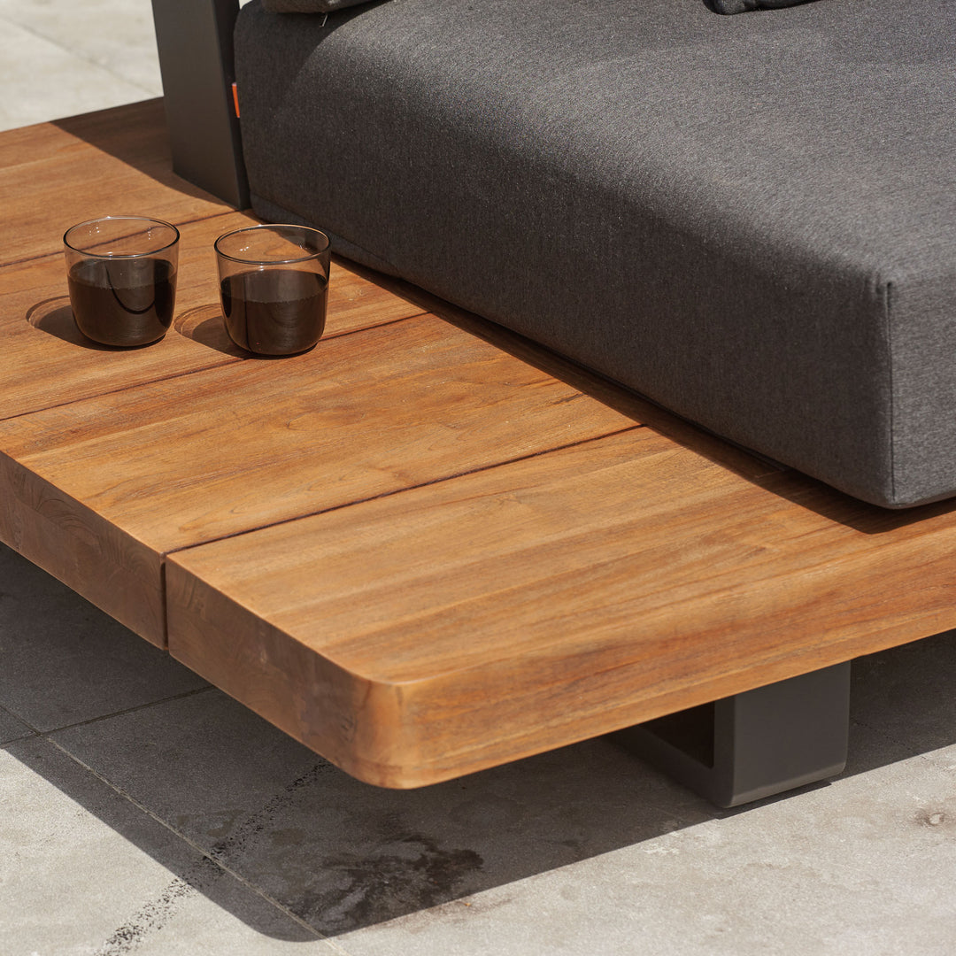 Sofas feature convenient, integrated teak side tables that make this set a statement piece.