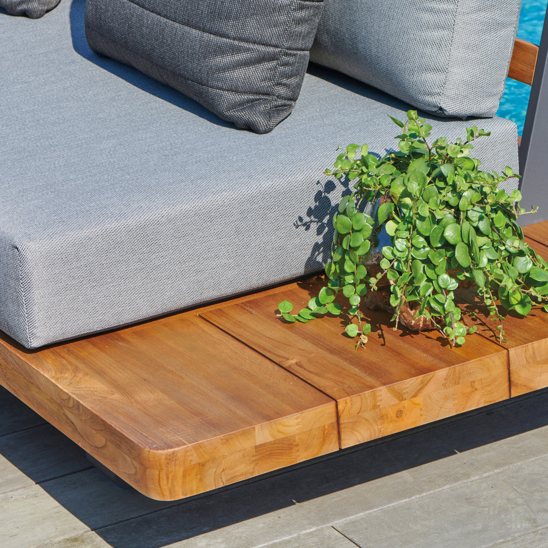 If you are searching for a statement piece that will draw everyone to your outdoor living space, then look no further. The Fitz Roy lounge set in teak is a beautiful warm blend of all natural, grade A, Indonesian certified robust teak wood on a strong lava aluminum frame combined with soft luxurious cushions. The finesse of the calm color palette of this lounge set fits in perfectly anywhere, while the modular seating and side tables provides you with space to enjoy your refreshments with friends and family. The Jones's will now be trying to keep up with you.