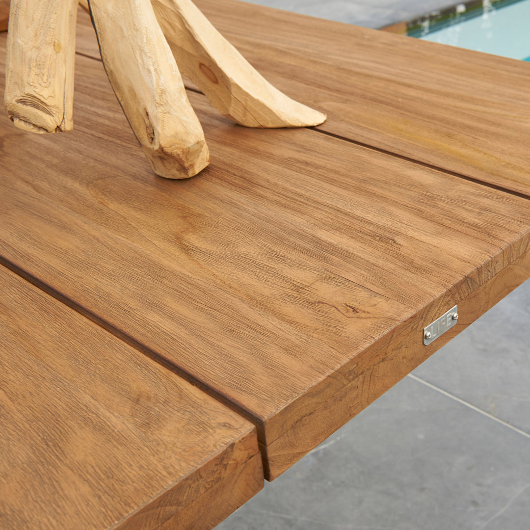 Compared to other woods, teak requires little maintenance thanks to its natural oils and resin. The wood will naturally patina over time to a beautiful silver-grey color. Regular cleaning is usually sufficient to maintain its appearance.